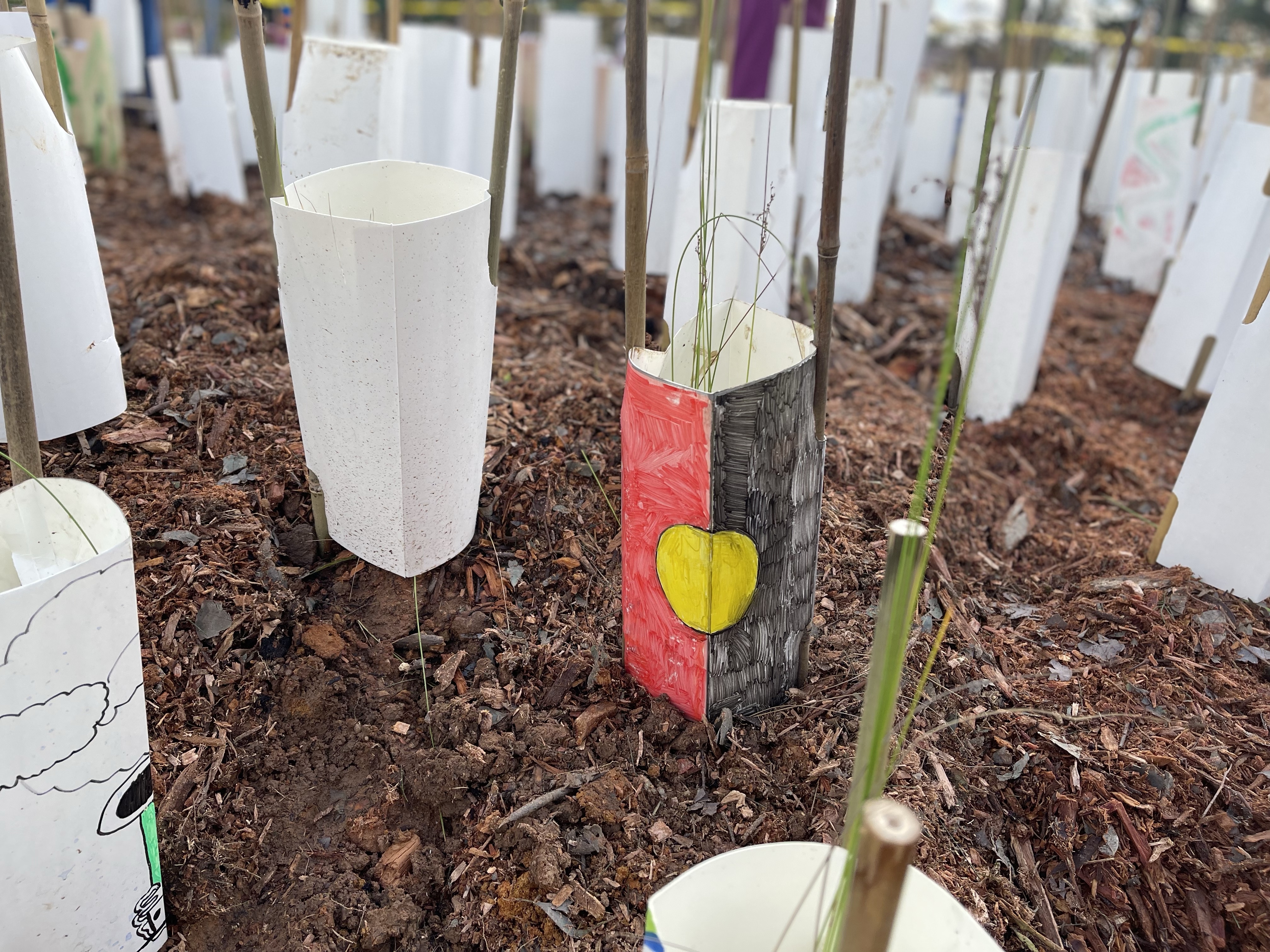 This picture below was taken at the Micro-Forest over the weekend, with wonderful artwork on this tree guard from a Kingsford Smith School Student.