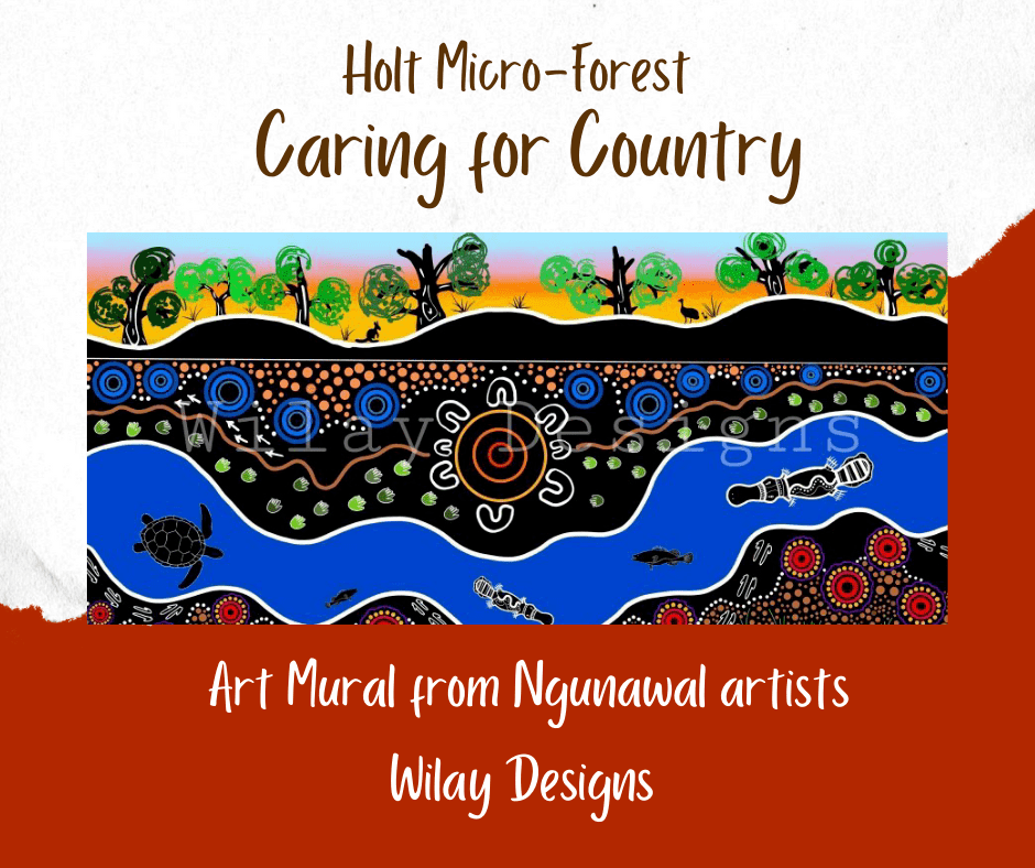 We are really excited to share with you some beautiful and deeply meaningful artwork that has been developed by Ngunawal artists Jazz & Kristal from Wilay Designs – Aboriginal Artists, for the Holt Micro-Forest community. We are still working through details of the location and dimensions for the mural in the park. In the coming months when these details are confirmed, Jazz & Kristal will visit the site to paint the mural. Jazz & Kristal will ask community members to participate by contributing a green handprint into the design, as a symbol of unity and commitment to care for country.