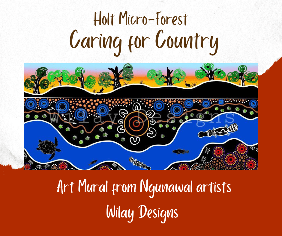 This painting represents our beautiful Ngunawal Country and culture. It also shares the important role we all play in order to make positive changes and acknowledges the journey the Holt Community are on to heal and care for Country alongside First Nation Peoples.